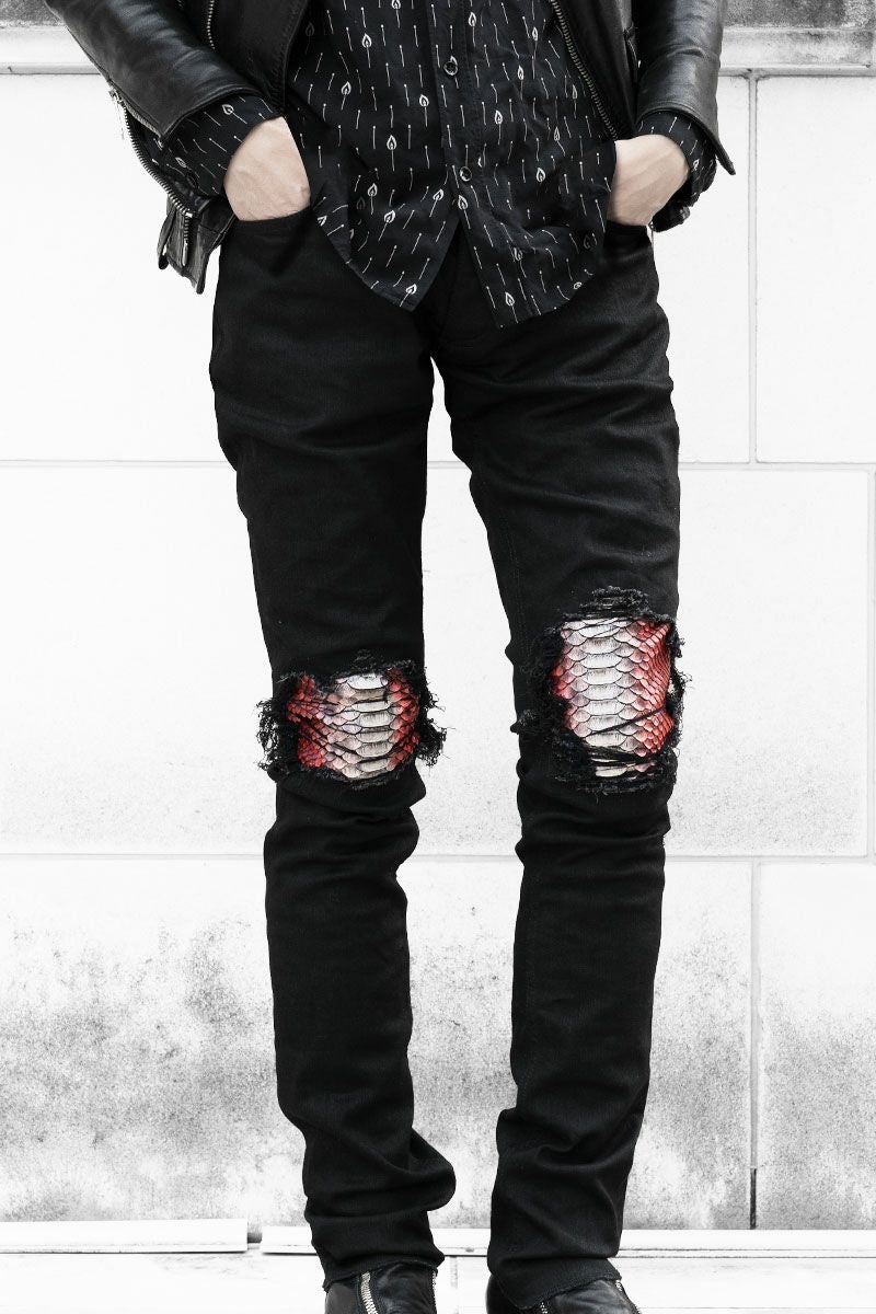 【FAGASSENT】レッド・ダイヤモンドパイソンレザーを、柔らかな特注ストレッチデニムの両膝に組み込む、日本製デニム作品 『 RED TRIGGER / レッドトリガー 』 英国LONDON×岡山産アルチザンブランド