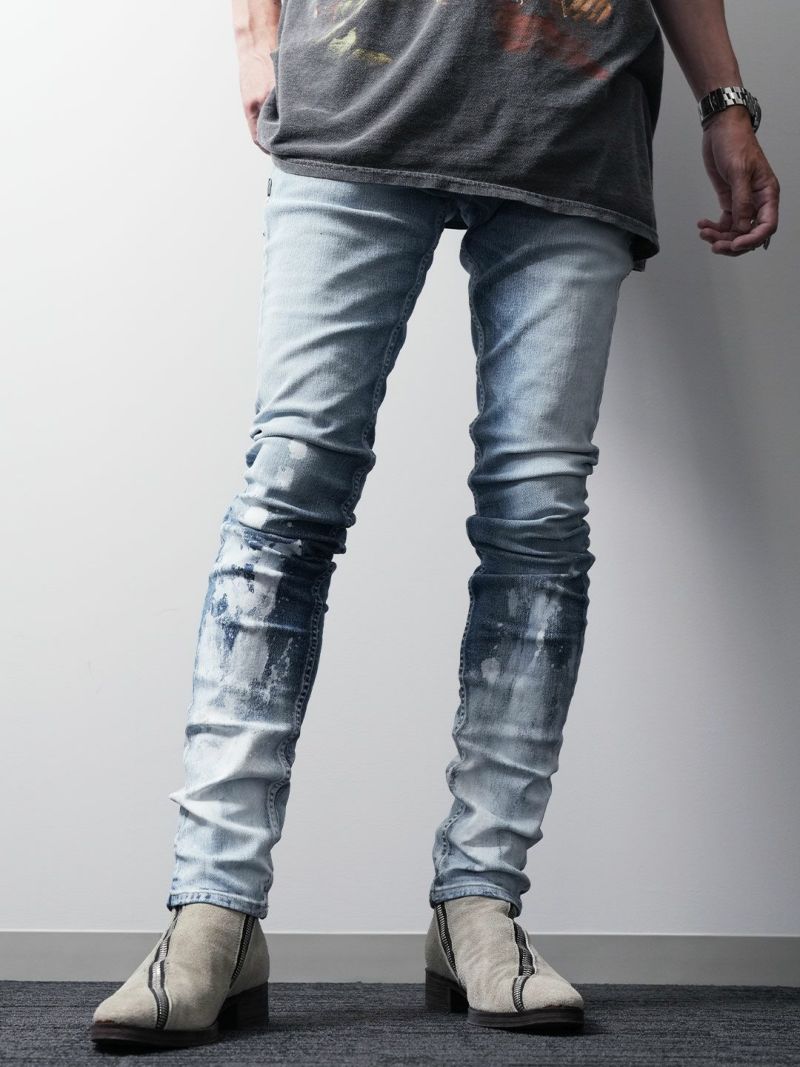 作品制作のスタートは、染色水として世界的にも最高峰とされる「岡山西部の上流水」で染め上げたインディゴデニム。そこに繊細な感覚でコントロールされるウォッシュやハンドブリーチで色を落とした後で、一瞬の気の迷いも許されないハンドペイントによる「ホワイトペイント」や「ホワイトスプレー」で色を乗せて作り上げていきます。