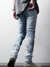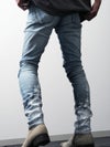 作品制作のスタートは、染色水として世界的にも最高峰とされる「岡山西部の上流水」で染め上げたインディゴデニム。そこに繊細な感覚でコントロールされるウォッシュやハンドブリーチで色を落とした後で、一瞬の気の迷いも許されないハンドペイントによる「ホワイトペイント」や「ホワイトスプレー」で色を乗せて作り上げていきます。